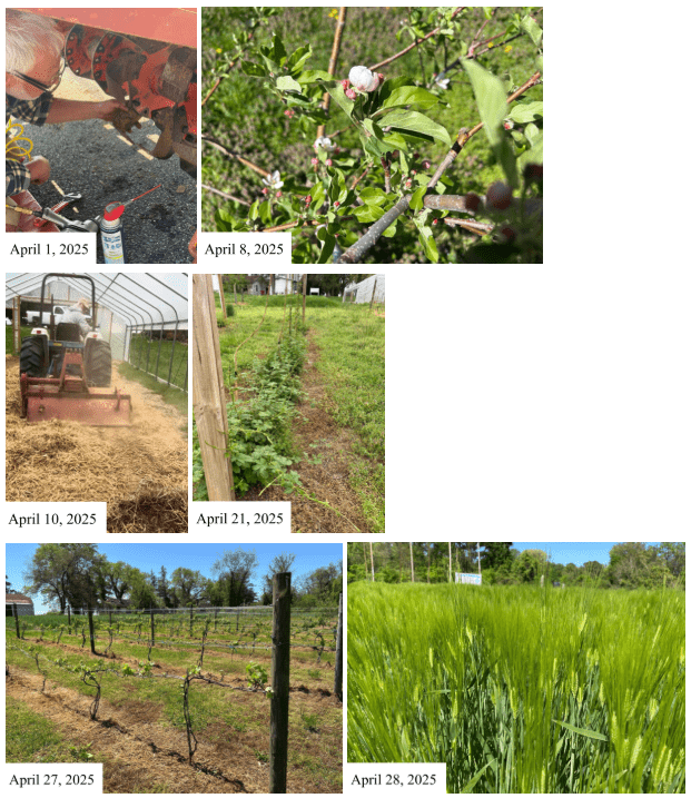 April 1st we took apart the field tiller attachment for the tractor, leaving 3 rows intact and adjusting the 4th so all the blades faced inward. This allowed us to till the fields only in the spots we needed, starting on the 3rd with the field we planted our pumpkins and gourds in last year. On the 10th we tilled the hightunnel, and checked our trees for any budding or signs of frost damage. The hops and the vineyard have shown excellent signs of growth so far this year, and the barley this time around is growing excellently, unlike last year when it died in the drought.