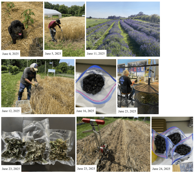 On June 3rd we successfully planted our pumpkins using the tractor attachment. On June 5th we used a trellising technique called the basket weave or the florida weave to get our tomatoes off the ground. On the 7th we mowed the orchard. June 10th we set up a drip irrigation system for our cut flowers. We got our first harvest of blackberries on the 17th, picking over 45.5lbs! On the 25th we put hay around in our hightunnel to help with weed control and we replanted some of our corn on the 27th.