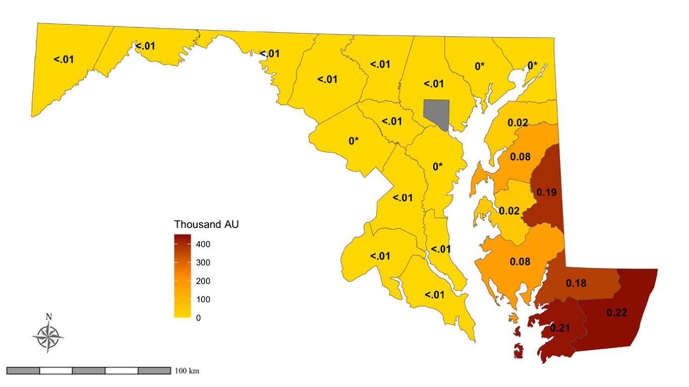Broilers compose approximately 83% of all AUs in Maryland, with four Eastern Shore counties containing an estimated 80% of inventories: Worcester (22% of statewide total), Somerset (21%), Caroline (19%), and Wicomico (18%). See Figure 1 for a state county map of broiler AUs.