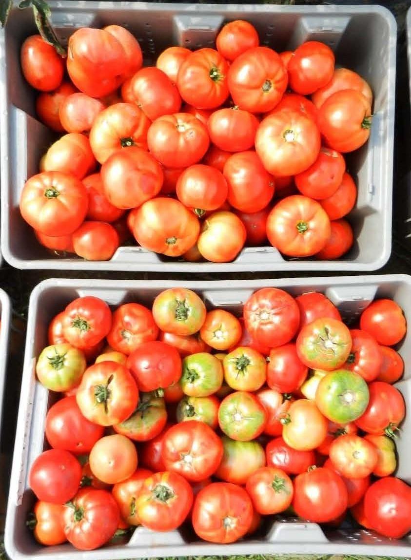 Bottom bin: Tomatoes harvested from black plastic rows with no shade. Total harvest: the poor looking (blotchy color, cracked, blossom end rot, etc. and smaller tomatoes) will be removed to take ‘Marketable yield’.