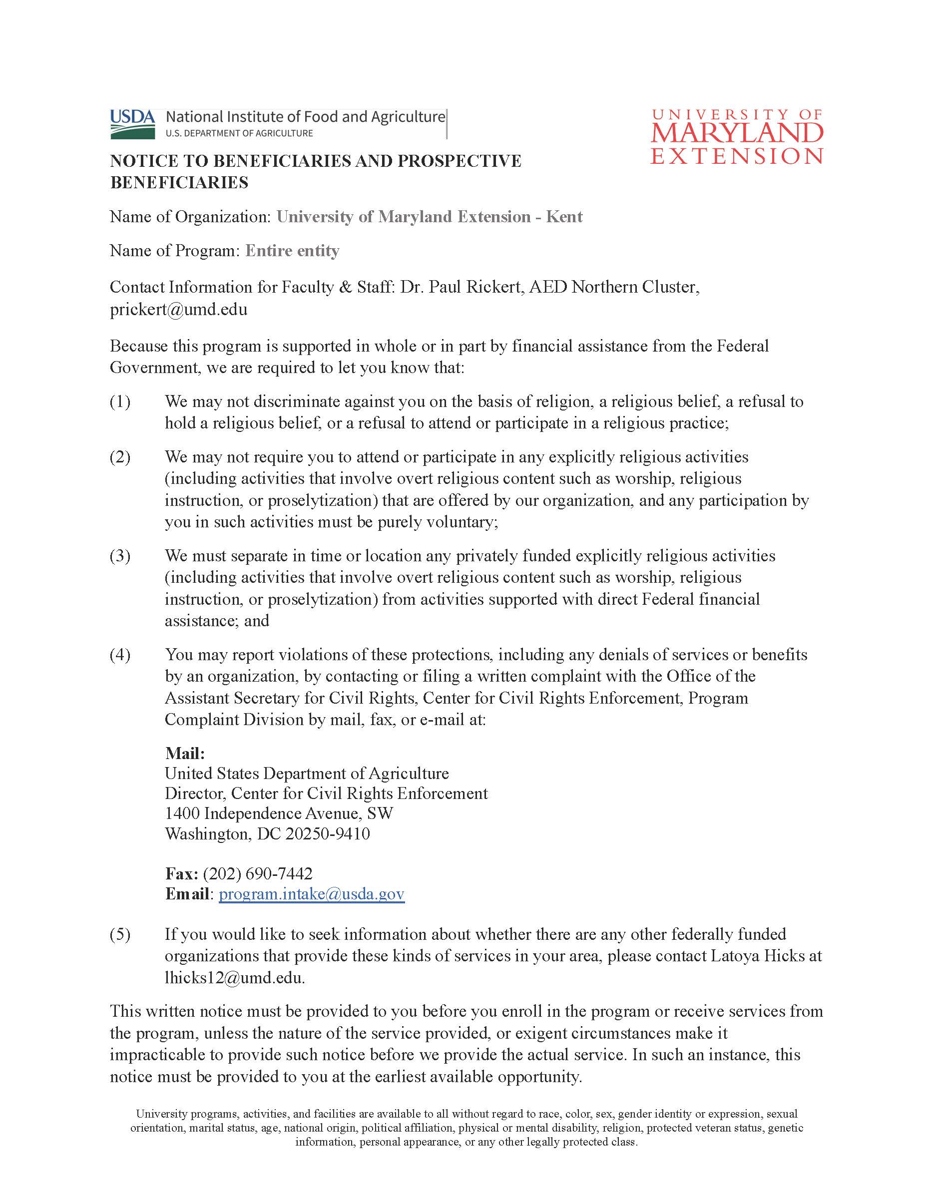 The University of Maryland Extension is a statewide, non-formal education system that provides resources and problem-solving assistance to citizens. The Kent County Extension provides educational programs in many topics that relate to agriculture, the Chesapeake Bay, youth programs, gardening, nutrition, health, and the environment.