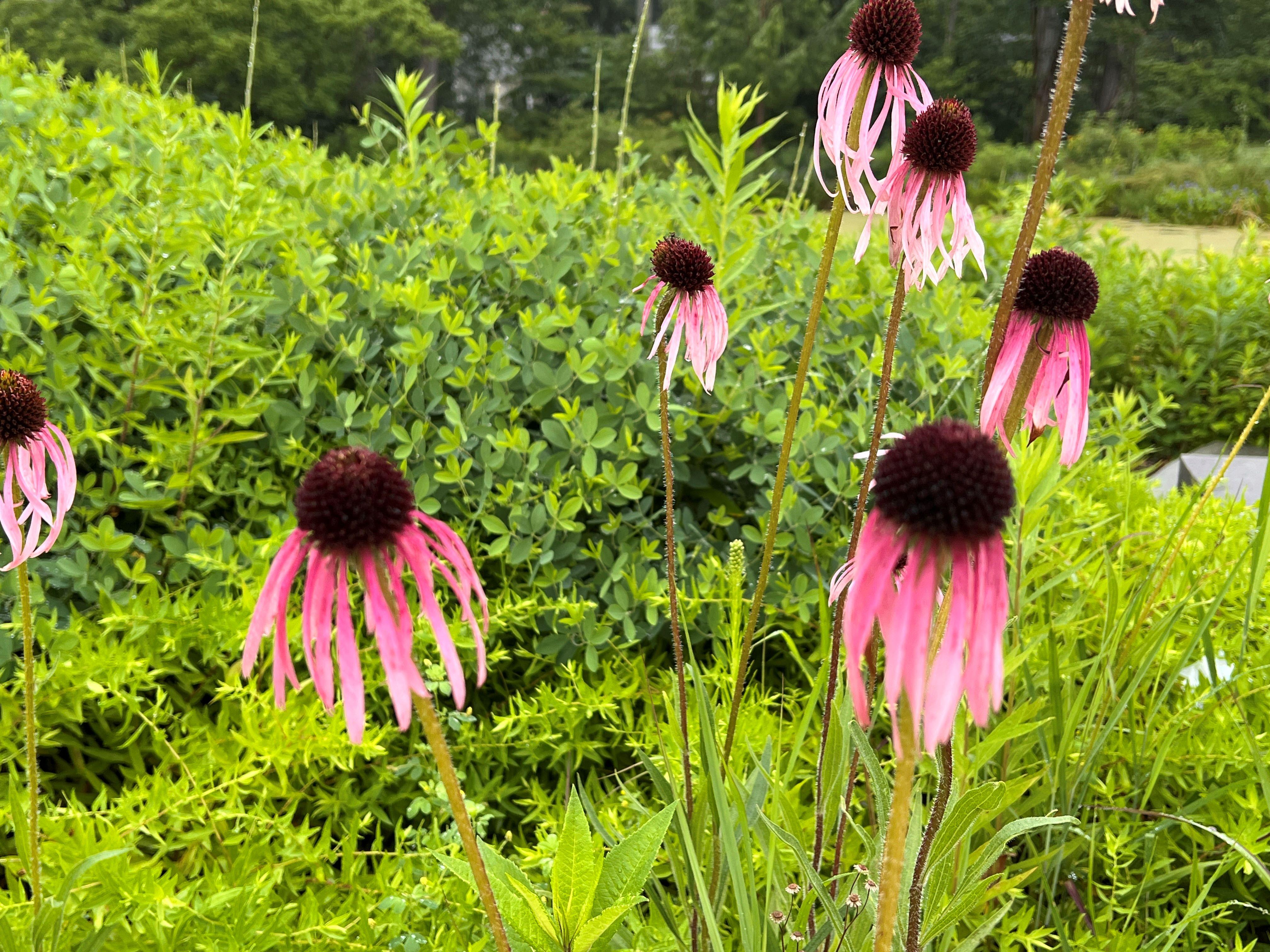 ...or American sweet gum is a native deciduous tree that thrives in the Eastern United States. The trees grow 60-80 feet tall, 40-60 feet wide and need full sun and love moist well-drained acidic soils. It grows with a straight trunk and a pyramidal to rounded crown with a shallow root system, which makes planting in the spring necessary for the roots to recover from transplant shock. Plants are cold tolerant from USDA zones 5-9, thriving in every county in Maryland. The dark green, glossy 4-8-inch-long and wide leaves are star shaped with 5-7 pointed lobes. Each fragrant leaf has a long stalk that is arranged in an alternate fashion on the branches. In autumn the leaves bring a rainbow of colors including a mix of yellow, gold, orange, red, burgundy, lavender and purple. The light gray bark forms irregular, deep furrows, while the twigs develop 2-4 corky wing-like ridges. In spring the monoecious yellow green flowers are arranged in round clusters with mature into gum balls. The gum balls are 1-3 inches in diameter and turn dark brown, staying on the trees until December to April when the clusters fall to the ground. Although these fruits provide food for songbirds like the American Goldfinch, they should be cleaned up in pedestrian areas due to their hard round bristly surface. Anyone who has stepped on a Sweet gum ball barefoot will never do so willing again. For those that wish the lovely silhouette and beautiful fall foliage but not the spiny gum balls, there are cultivars that do not produce fruit including ‘Hapdell’ and ‘Rotundiloba’. The summer foliage provides food for the Imperial Moth larvae and the Hickory Horned devil larvae, while the bark is enjoyed by rabbits, mice and beavers. The trees are resistant to soil compacted soils, deer, drought, fire, heat, rabbits.