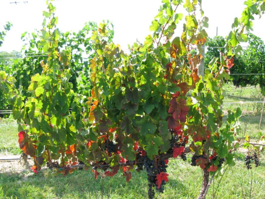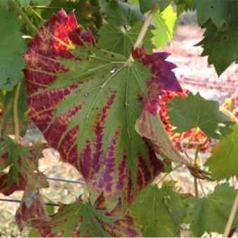 It is not uncommon to walk a vineyard row and find some vines with red leaves somewhere in the canopy. Red leaves can appear at any time in the growing season and are caused by many biotic (viruses, bacteria, and fungus) and abiotic (nutrient deficiencies, cold injury, and damage to root systems, etc.) stresses. Anything that can cause blockage or stress in the vascular system, where water and nutrients are transported, can result in the development of red leaves. Because of the variability in timing and pattern of appearance and the overlapping of the symptoms, it may be difficult to identify the cause based solely on visual symptoms. The best strategy is to get the vines tested for accurate diagnosis as soon as possible. The following are examples of abiotic and biotic stresses that are often associated with red leaves on grapevines.