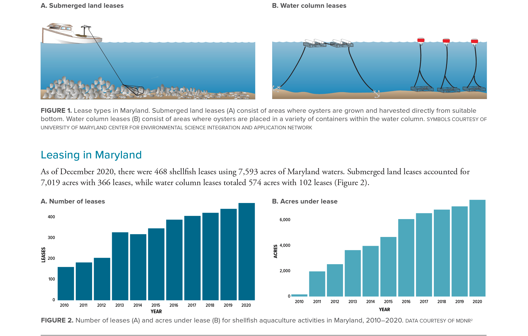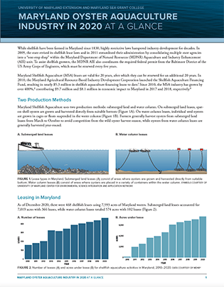 Check out this report to get a glimpse into the Maryland oyster aquaculture industry using data from 2023. The report shows an overview of production methods, leasing, and factors that affect annual oyster harvests in Maryland aquaculture operations. This report is authored by Mathew Parker, Donald Webster, and Rebecca Thur.