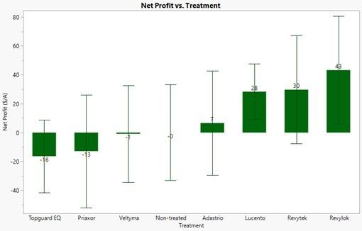 Figure 3. Net profit of 2024 fungicide treatments. Each error bar is constructed using 1 standard deviation from the mean. No significant differences between treatments (α=0.10).