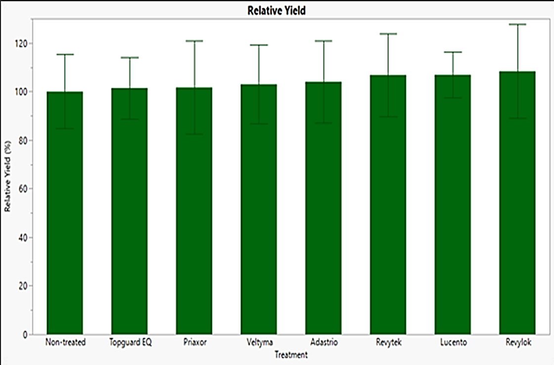 It is common for fungicides to keep plants greener for longer, and we observed a significant difference in plant greenness prior to harvest in plots that received a fungicide application (p=0.0019). Revytek, Revtylok, and Veltyma had the highest green stem scores, with the non-treated control the lowest. Treatments similar to the control were Lucento and Adastrio.