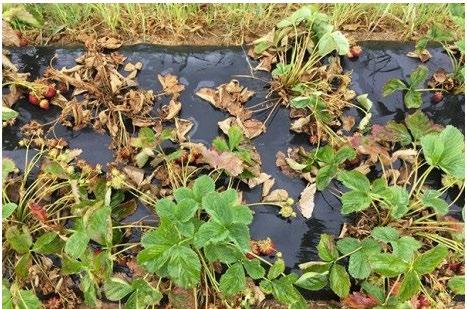 Some newer cultivars grown in plasticulture appear to be quite susceptible. Since this disease is caused by a bacterium and not a fungus, copper-based materials are needed instead of standard fungicides (which have no effect) and should be applied in the spring to protect healthy foliage and berry caps from disease spread. Make these applications only if the disease is known to be present, as phytotoxicity can occur with multiple applications and when drying conditions are prolonged. It is unlikely that any spray applications will be needed for this disease in the fall. In addition, Actigard, which induces the plants’ systemic activated resistance, provided some control efficacy based on trials conducted in Florida. Note that Actigard should be applied at the lowest label rate. Higher rates were found to reduce yields.