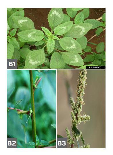 Spiny amaranth leaves are egg- to diamond-shaped, lack hairs on the surface, and sometimes contain a white or purple watermark (Photo B1). A spine (0.2-0.4 in.) will be present at the base of the leaf (B2). This species may have longer leaf petioles like Palmer amaranth.