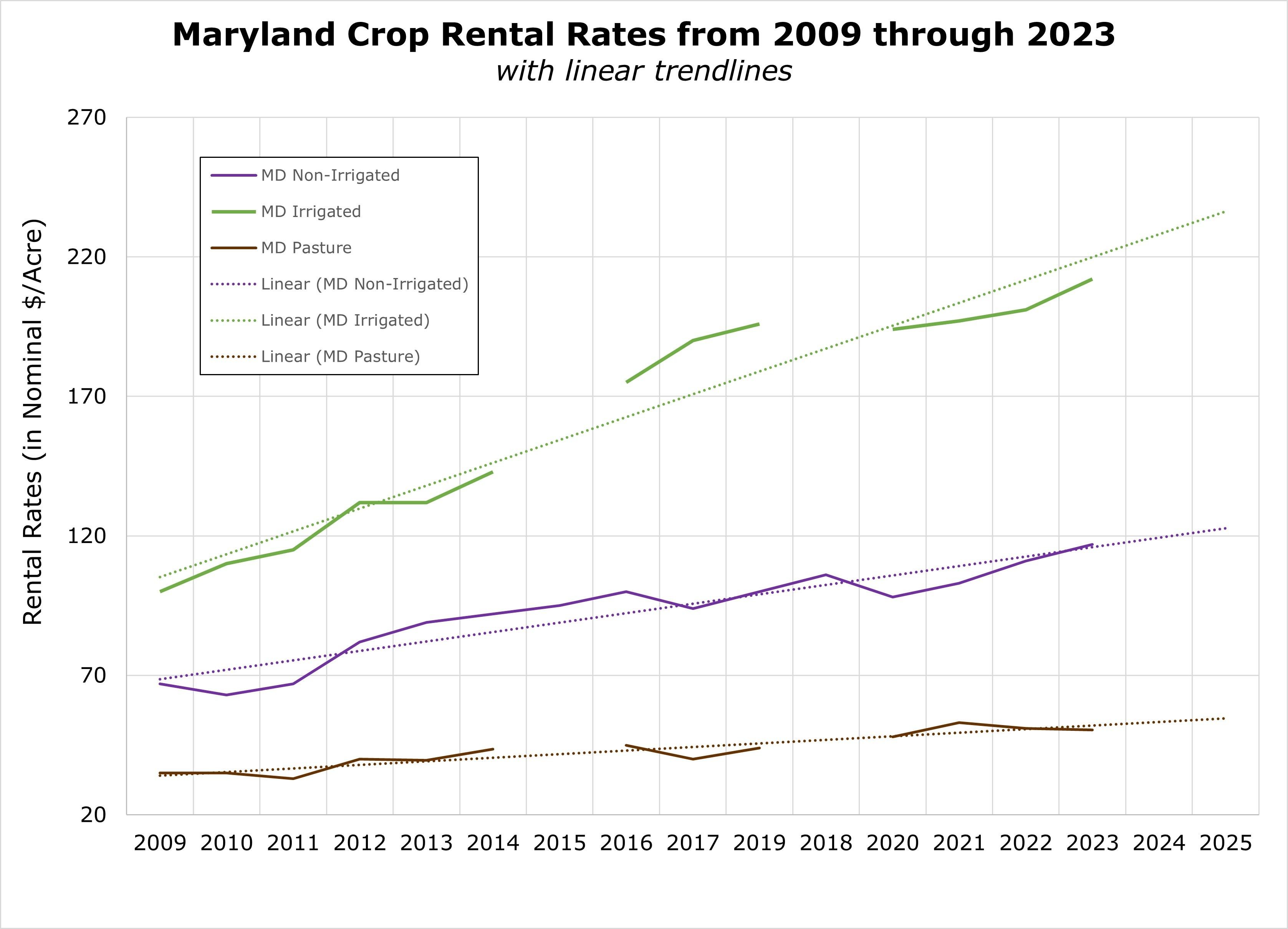 - Maryland Cash Rental Rates (2009-2025): Includes graphs and tables showing annual state averages for non-irrigated cropland, irrigated cropland, and pastureland.