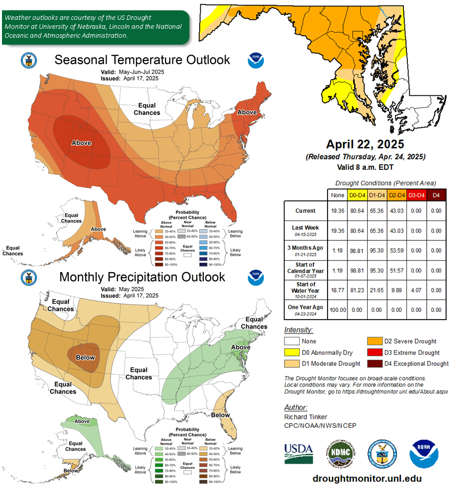 Winter in Maryland has been wet and no part of the state is under any drought condition. One month outlook is for 33-50% probability of above normal precipitation and 33-40% probability of above normal temperatures.