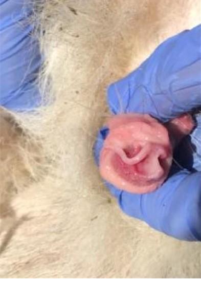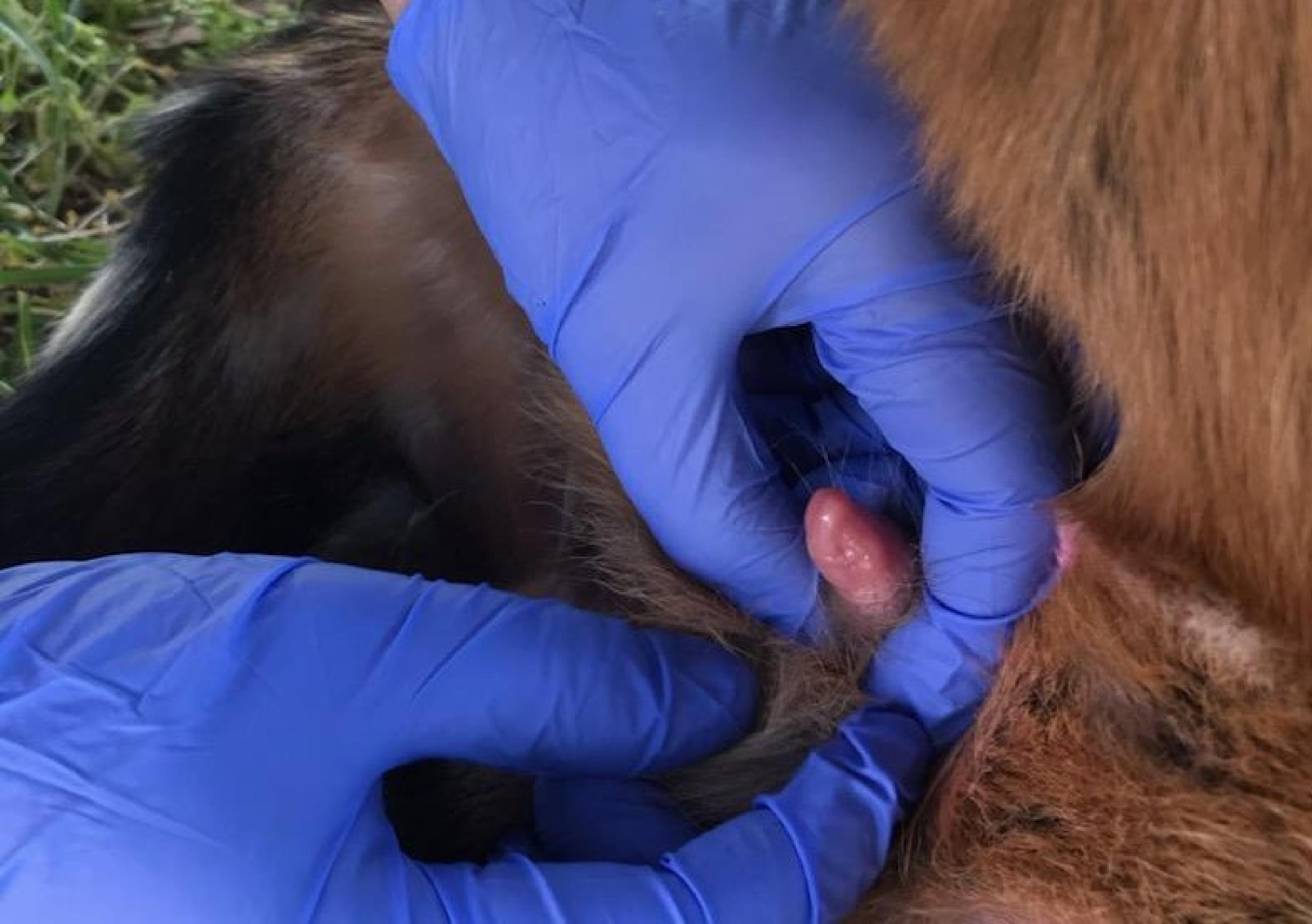 A veterinarian should immediately examine any male sheep and goats suspected of obstruction. The veterinarian may want to x-ray the animal to determine the extent of the obstruction. If a veterinarian cannot examine the animal in a timely manner, the owner can assess the animal by sitting the animal on his rump and extruding his penis (Figures 4 and 5). Once the penis is extruded, the owner can examine the urethral process to feel if there are calculi stuck at this site (Figure 6). If the urethral process is blocked, blood flow can decrease, causing the urethral process to turn white or black. The owner should inform the veterinarian immediately as this is an emergency situation.