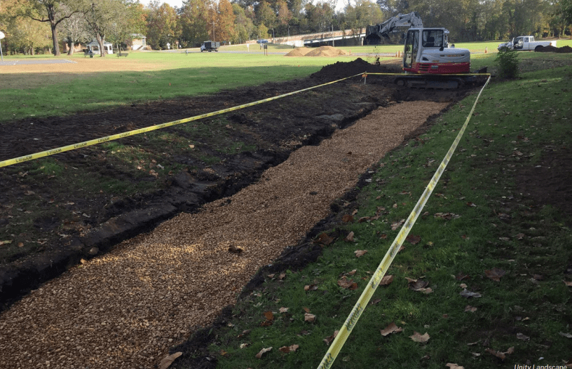 An infiltration trench or basin is a long, narrow, stone-filled trench that collects stormwater and allows for infiltration into the soil, or a constructed depression where runoff and sediment are trapped while water infiltrates the soil.