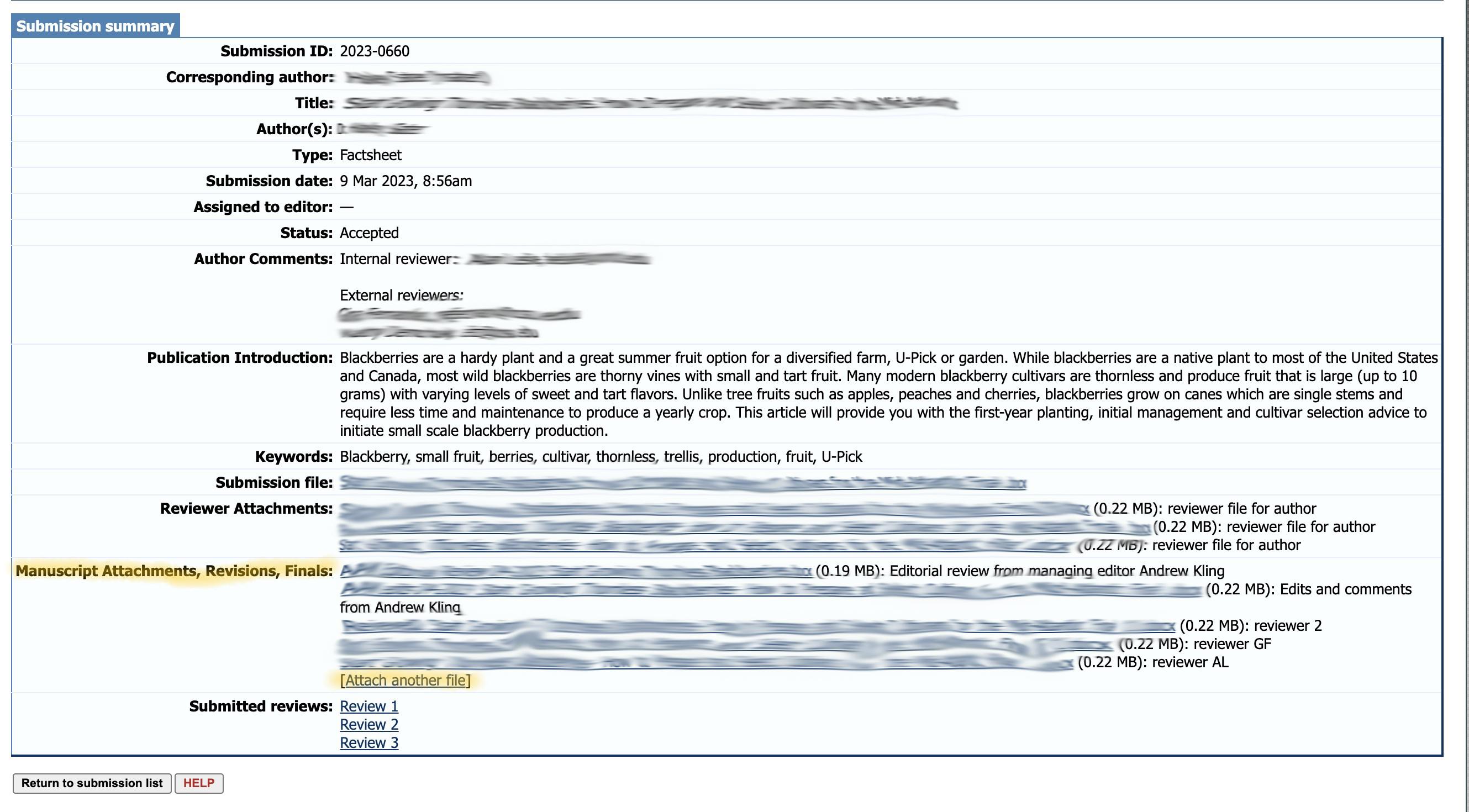 After the author(s) have completed their revisions, the submitting author will upload two (2) new documents to the FastTrack submission page for the managing editor’s review. The first is the revised draft; the second should address the main concerns and suggestions raised in the editorial review. Adding text as needed to the original editorial review is recommended. Please be sure to add these as new files; select the link "[Attach another file]" in the Manuscript Attachments, Revisions, Finals section to upload the new files. See image below (highlights added). Please do not upload them as a new document submission, which would create a new FastTrack number for the same title.