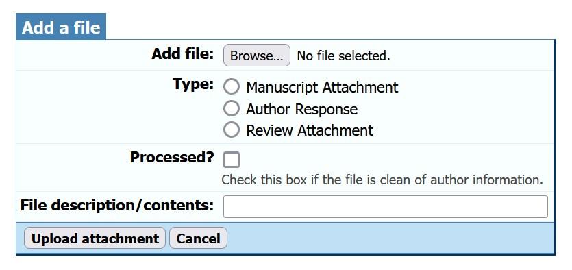 FastTrack can accommodate different file types, such Word files, PDFs, and images such as .jpgs and .gifs. Please note that FastTrack does not accept PowerPoint slides. (Any PowerPoint slide deck that the author wants to include for review should be saved as a PDF.) The “Add file to submission” screen enables you to upload additional files. Choose “Manuscript Attachment.” Provide a short description of the new file.
