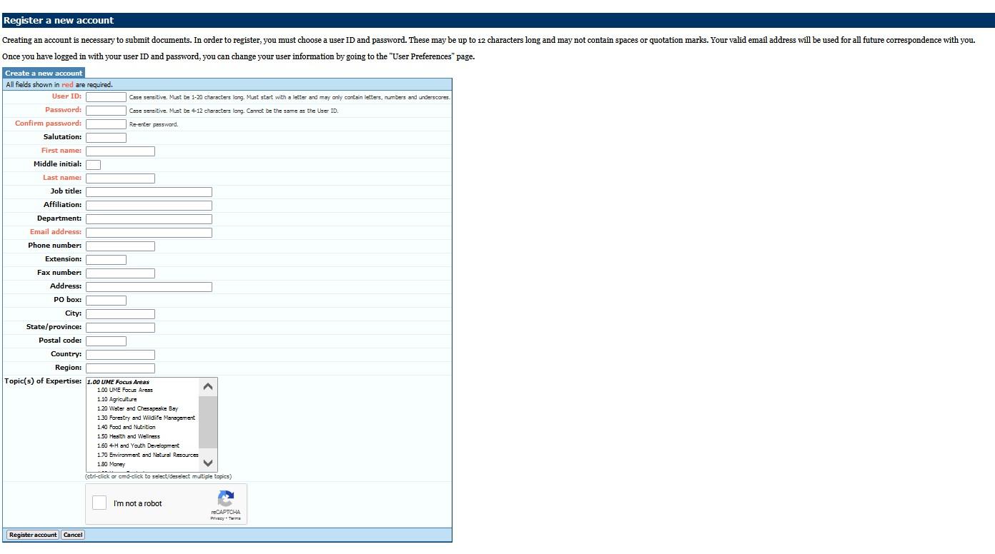 To create an account, complete all the required fields (with description text in red). Additional fields may be populated as needed. Be sure to select at least one “Topic of Expertise” in the menu box. Note that you will not be restricted to these fields when it comes time to submit your publication (see step 4 below). When finished, click “Register account.”