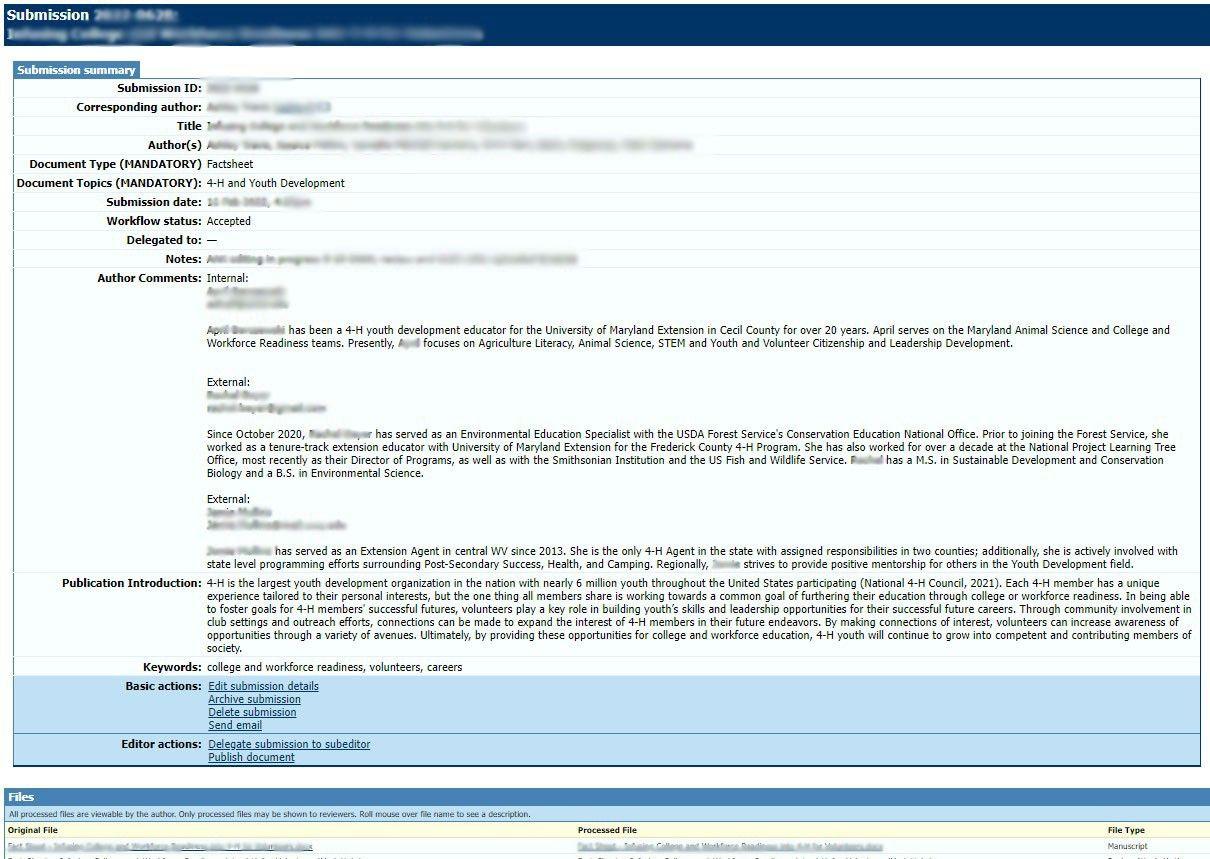 You will need to return to this screen throughout the publishing process, as it will also contain a record of all files provided by the reviewers and by the managing editor. Additionally, the graphics and publication specialist will upload a final version of the publication for your reference. You will be able to download each file as needed.