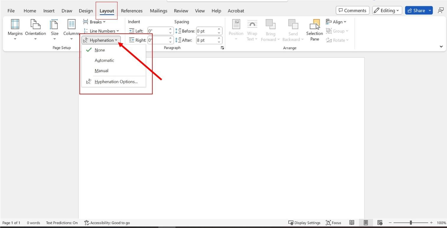 Our publication guidelines require the Hyphenation feature to be turned off. Hyphenation is turned on by default in Word. Here’s how to turn it off: