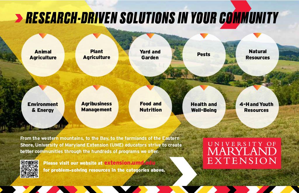 Welcome to the University of Maryland Extension (UME) of Washington County which is part of a statewide, non-formal education system within the College of Agriculture and Natural Resources of the University of Maryland, College Park. This partnership also includes support from USDA as well as the county government. The Washington County UME faculty and staff provide a broad range of outreach through workshops, seminars, classes, clinics, newsletters, consultations, and media efforts.