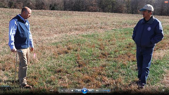 Jerry Spence: We're now standing in a grassed waterway. We installed a grassed waterway a few years ago to remedy a gully erosion problem in the field. We had an area of concentrated flow from the parking lot of the Agricultural Service Center upslope of the field. Water congregated, ran off the parking lot, and then came down through the field, causing erosion. So we installed a grassed waterway using tall fescue to convey the water downslope safely. Its sole mission is to move the water downslope without causing gully erosion. Our technical staff designed this waterway and helped install it by being here and checking grades during installation. It's still a fair stand, but we need to overseed it with some more tall fescue to thicken it up. So far, it is holding very well.