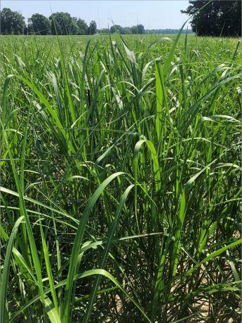 First-year stand of miscanthus (5-6 feet tall). This stand was planted in early May 2019 and the photo was taken in late July 2019.
