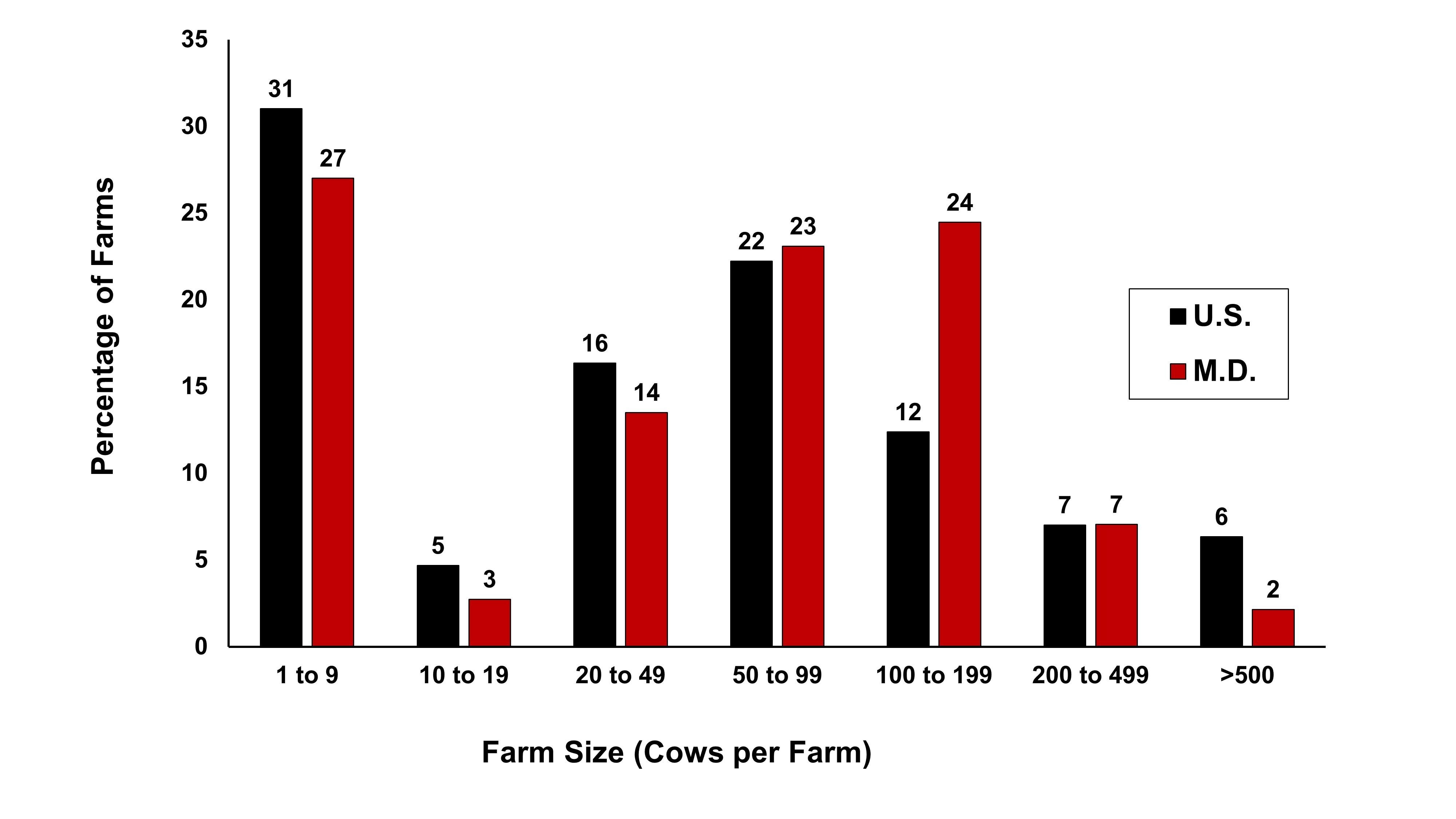 Similar to the U.S., the majority of Maryland's dairies are small (<100 dairy cows per farm). In Maryland, the vast majority of cows (~80%) reside on farms that house less than 500 cows.