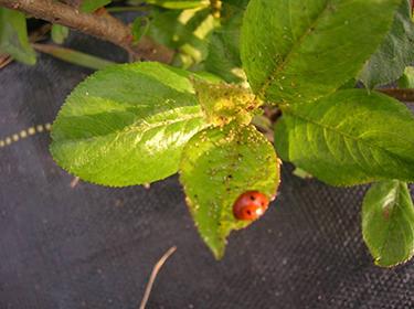 Japanese Beetle (Popillia japonica) is present from mid-June through July. Monitor orchard throughout this time period as often as possible. Beeltles rapidly consume foliage and fruit and can have a major detrimental affect on yield. Organc control methods are available.