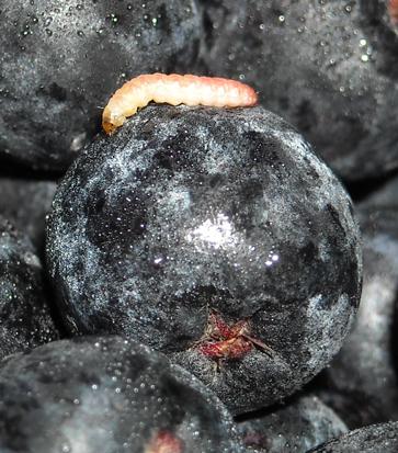 Cherry Fruitworm (Grapholita packardi), a lepidopteran (butterfly/moth) larvae has been noted for the past two years feeding inside the fruit. Less than 5% of the fruit has been damaged annually. The life cycle of this insect is known and organic control should be possible. If adults are noted in May, spray for larvae during the first week of June. The larvae reside inside the fruit throughout the growing season and emerge about about harvest time. This picture was taken after washing the fruit. The larva was coming out of the fruit.