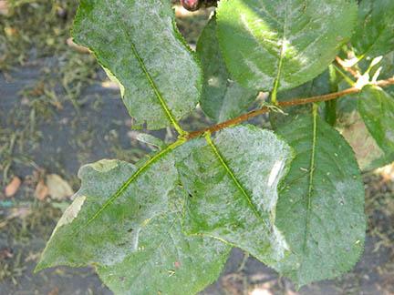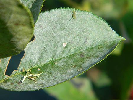 Powdery Mildew is a group of fungi that cause white or gray powdery spots or patches on leaves, flowers and fruit. It usually occurs when temperatures and humidity are high. Infected leaves will drop off and near complete defoliation can occur. This is detrimental for fruit production. Monitor at beginning of June, throughout summer. Control can be with various fungicides and organic controls like potassium bicarbonate.
