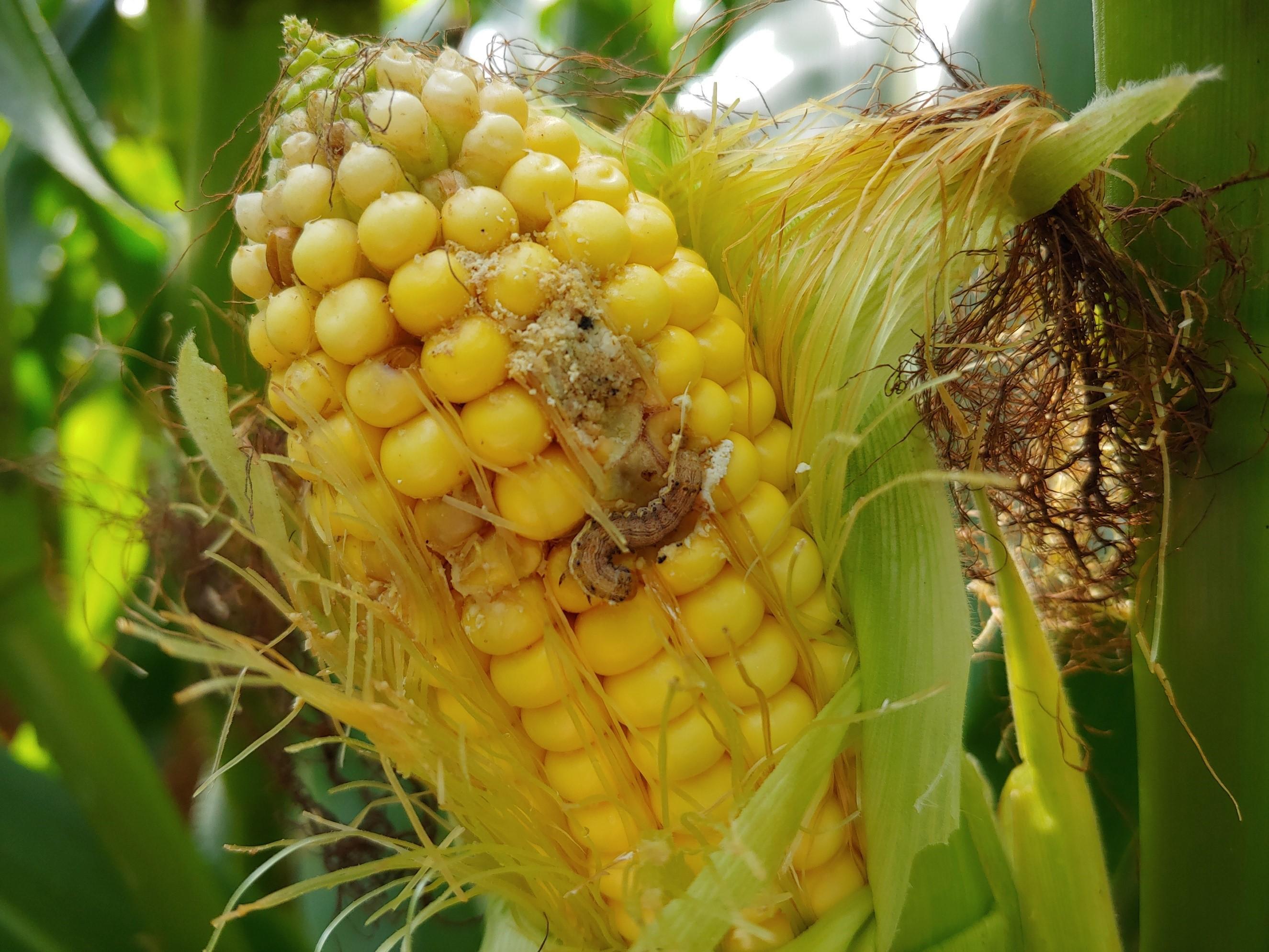 Timely sprays of non-Bt hybrids help minimize ear damage by corn earworm and other ear invading insects. Moths are attracted to ears with fresh green silks, where most eggs are laid. The first spray should be timed for early silking, after which new fresh silks that are unprotected will emerge. This means spray intervals should be tightest during fresh silk. In addition, when weather is in the 90s (°F), it takes 2 days for eggs to hatch and 2 hours for small larvae to move down the silk channel and begin feeding on the ear tip, where they are protected from foliar sprays. Thus, it is especially critical to maintain protection on silk tissue when both temperatures and moth pressure are high.