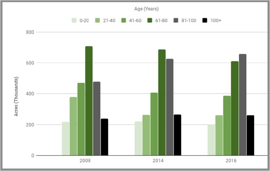 - Changes in forest management & composition: The majority of Maryland forests are between 60-100 years old, and there is less forest harvest activity today, resulting in a lack of young regenerating woodlands that provide thick cover needed by bobwhite quail. (Fig. 3).