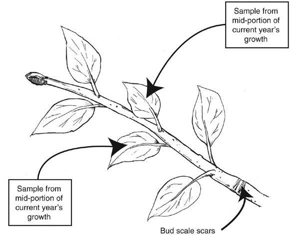 Consult Table 1 to determine the appropriate time to sample, the number of samples/plant part, and the location on the plant for each fruit crop. Figure 1 has additional information on the proper sampling location.