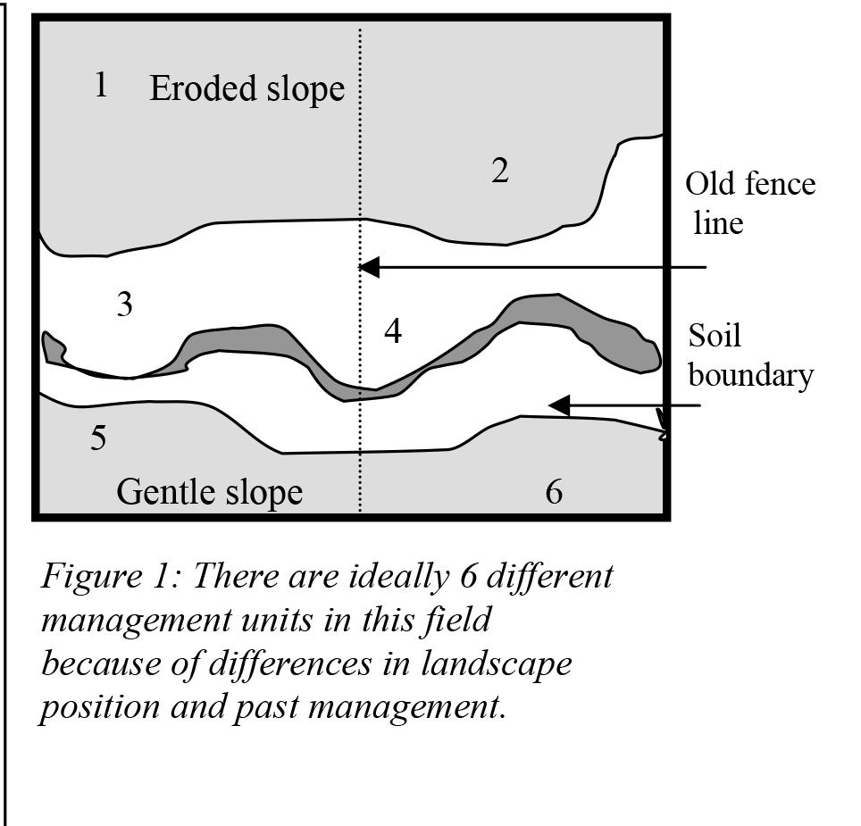1. Define the management units. A management area is an area that can and will be managed separately from any other. If different field areas have different soil types, past cropping histories, or different production potentials, these areas should be sampled separately and managed separately (See Figure 1).