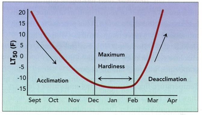 - When the low temperature occurs in relation to the stage of acclimation of the vines (See Figure 1 on page 2 from Zabadal et al., 2007.)